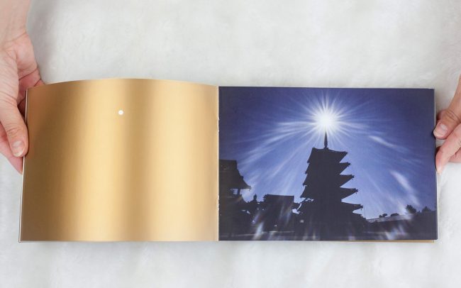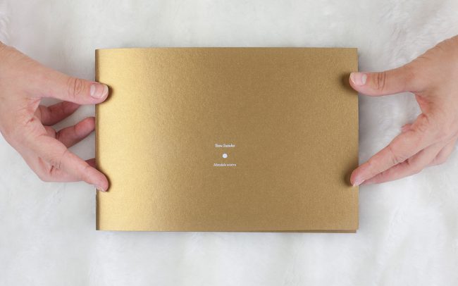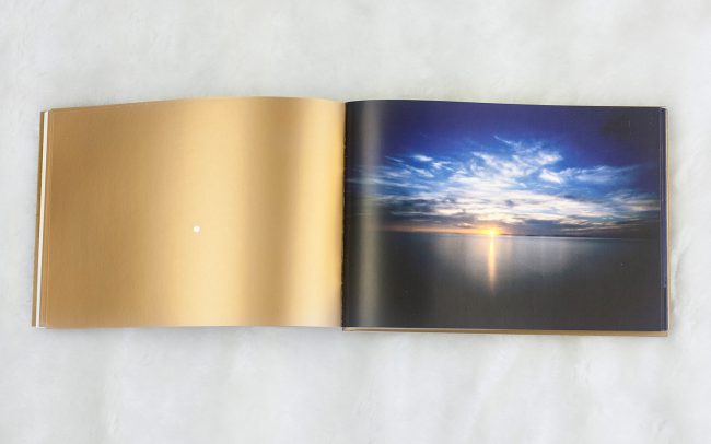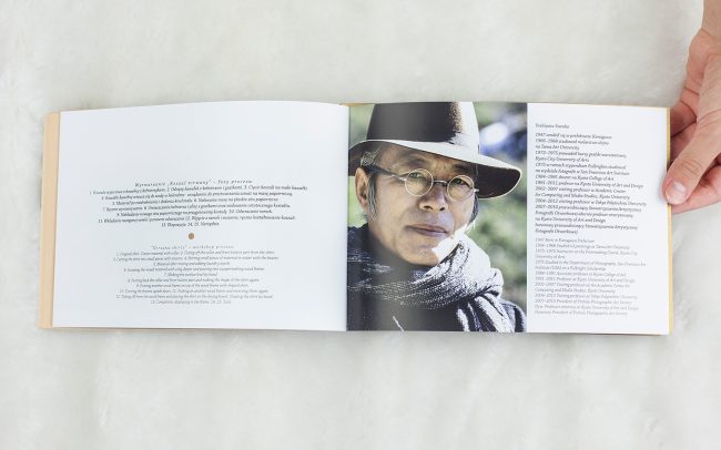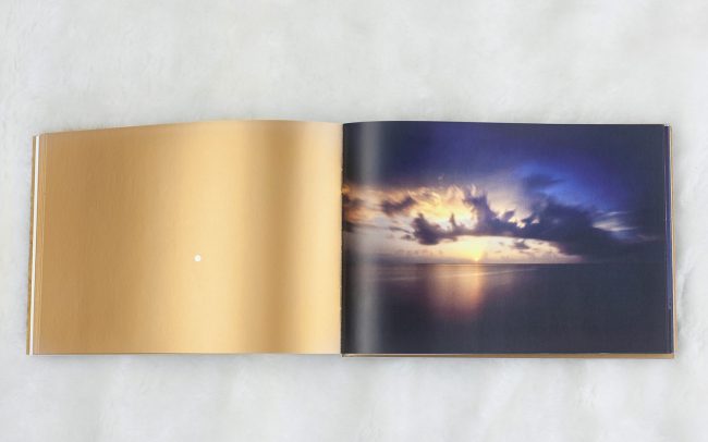 Koncepcja albumu opierała się na nawiązaniu do procesu fotografowania aparatem typu pinhole. Pinhole to dosłownie pudełko z dziurką i materiałem światłoczułym, jednak to dzięki temu prostemu otworowi powstaje cała magia fotografii. Na każdej lewej stronie rozkładówki, na złotym tle pojawia się więc dziurka, biały punk, która jest lustrzanym odbiciem słońca pojawiającego się na fotografii obok. Wybrałam kolor złoty, by podkreślić wagę światła słonecznego, które jest głównym elementem fotografii artysty. Sam format albumu jest podyktowany formatem materiału światłoczułego, na jakim pracuje Suzuka. Wszystkie teksty pojawiające się w albumie napisane są delikatnym i eleganckim krojem pisma, który daje poczucie otwartej przestrzeni i jest stosownym tłem do bogactwa barw i świetlnych plam pojawiających się na fotografiach.