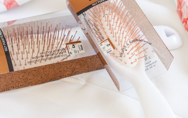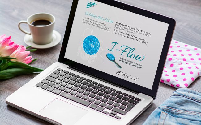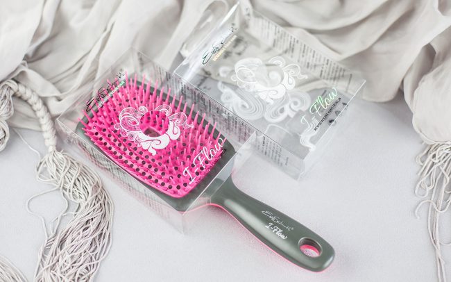 Przykładem świadomej pracy z kształtem wykrojnika jest opakowanie szczotki do włosów I-Flow z kolekcji Ewa Schmitt. Szczotka jest ultralekka, posiada liczne otwory (pozwalają na przepływ powietrza, co znacznie skraca proces suszenia) i jednoelementową poduszkę. Dzięki temu jest idealna zarówno do nakładania odżywki podczas kąpieli, jak i do suszenia i modelowania. Opakowanie powinno być takie jak szczotka — lekkie, delikatne, zgrabne i nowoczesne. Wzór na opakowaniu nawiązuje zarówno do wspomnianego przepływu powietrza przez otwory, jak i do samej struktury włosów. Otwór na środku pozwala dotknąć uginających się elastycznych igieł.